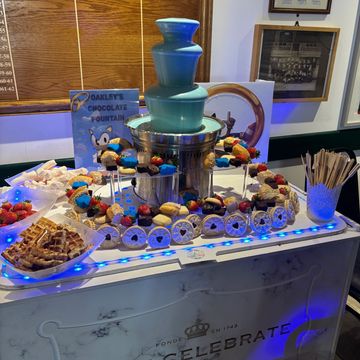 This really does add the wow factor, our compact twin chocolate fountains on led light up based, Choose milk, dark, white chcoclate for up to 50 people £249 with 8 dips to choose from.